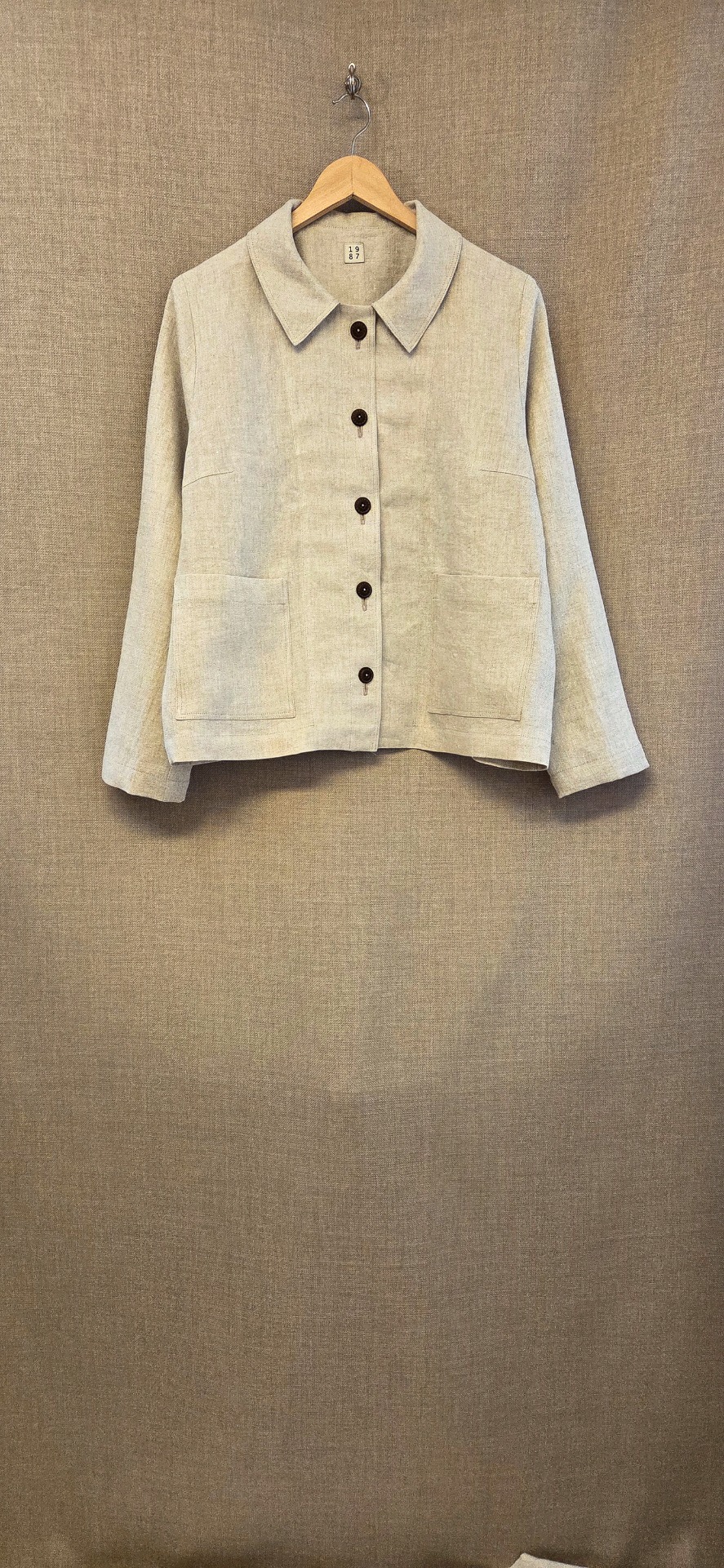 Ofodrad, rak jacka i ett lite grövre lin, med bystinsnitt för bättre passform. Söm mitt bak, stora utanpå fickor fram. Fin, rundad krage och som knäpps med stora kokosknappar. Långa ärmar med manschetter och stora kokosknappar. Jackan på bilden är i ett naturfärgat linnetyg, men går att få i andra färger. Längre upp i butiken kan du se den i svart lin.
