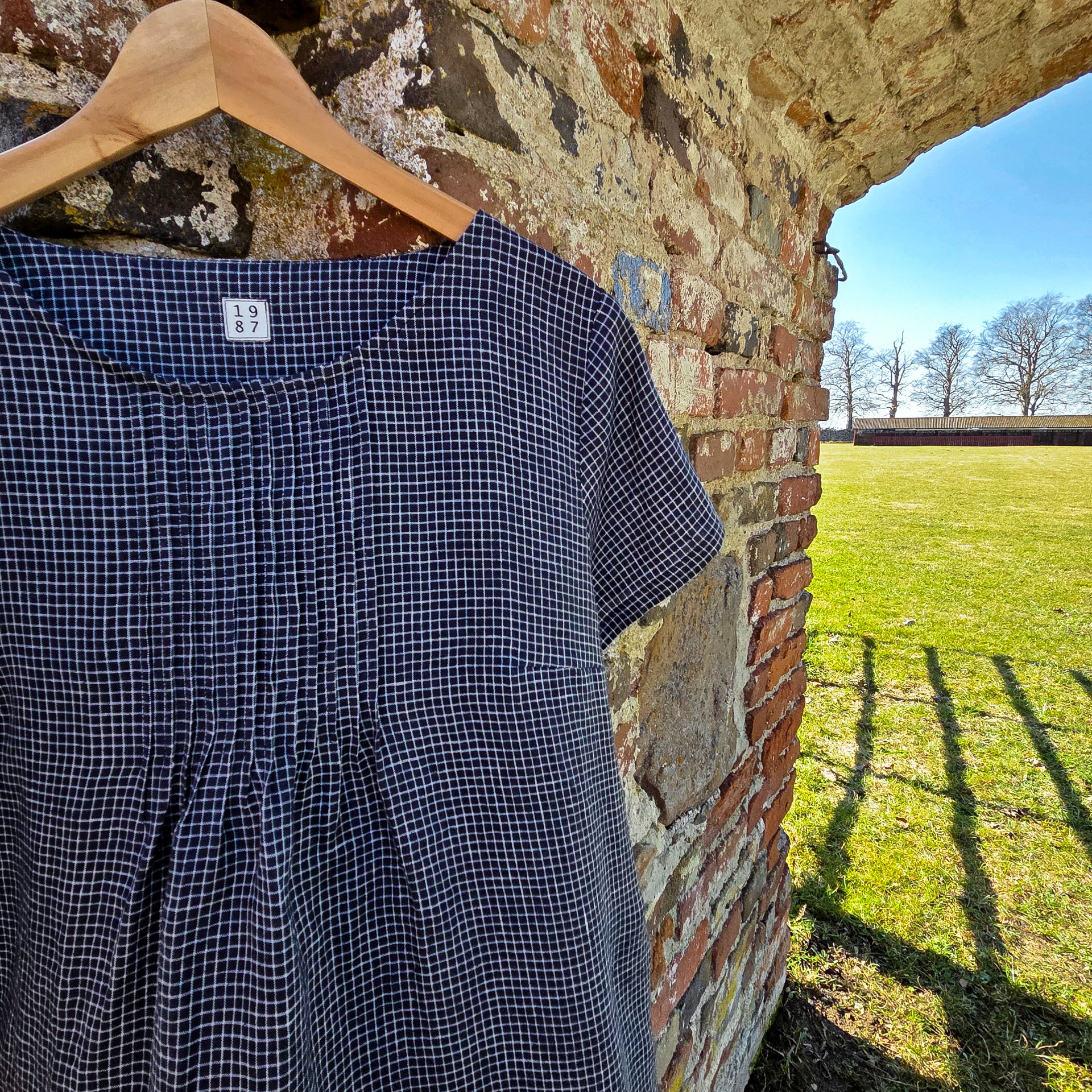Klänningen Alfia med fina stråveck var självklar i detta smårutiga mörkblå linnetyg.