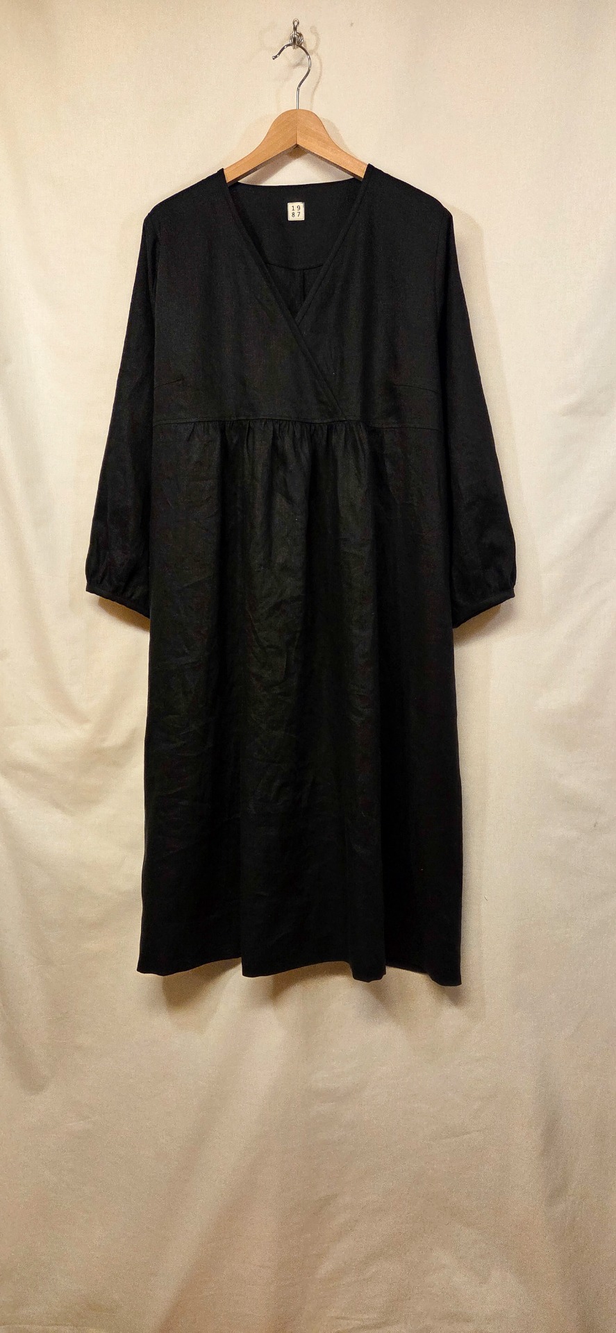 Vår senaste linneklänning är i ett lite krispigare och blankare lin. Perfekt att styla med olika accessoarer till både vardag och fest. Bandkantad omlott fram och bystinsnitt för bättre passform. Avskuren fram och bak mot rynkad kjol men slät i sidorna. Långa ärmar som är rynkade mot smal kant. Rundade fickor i sidorna.