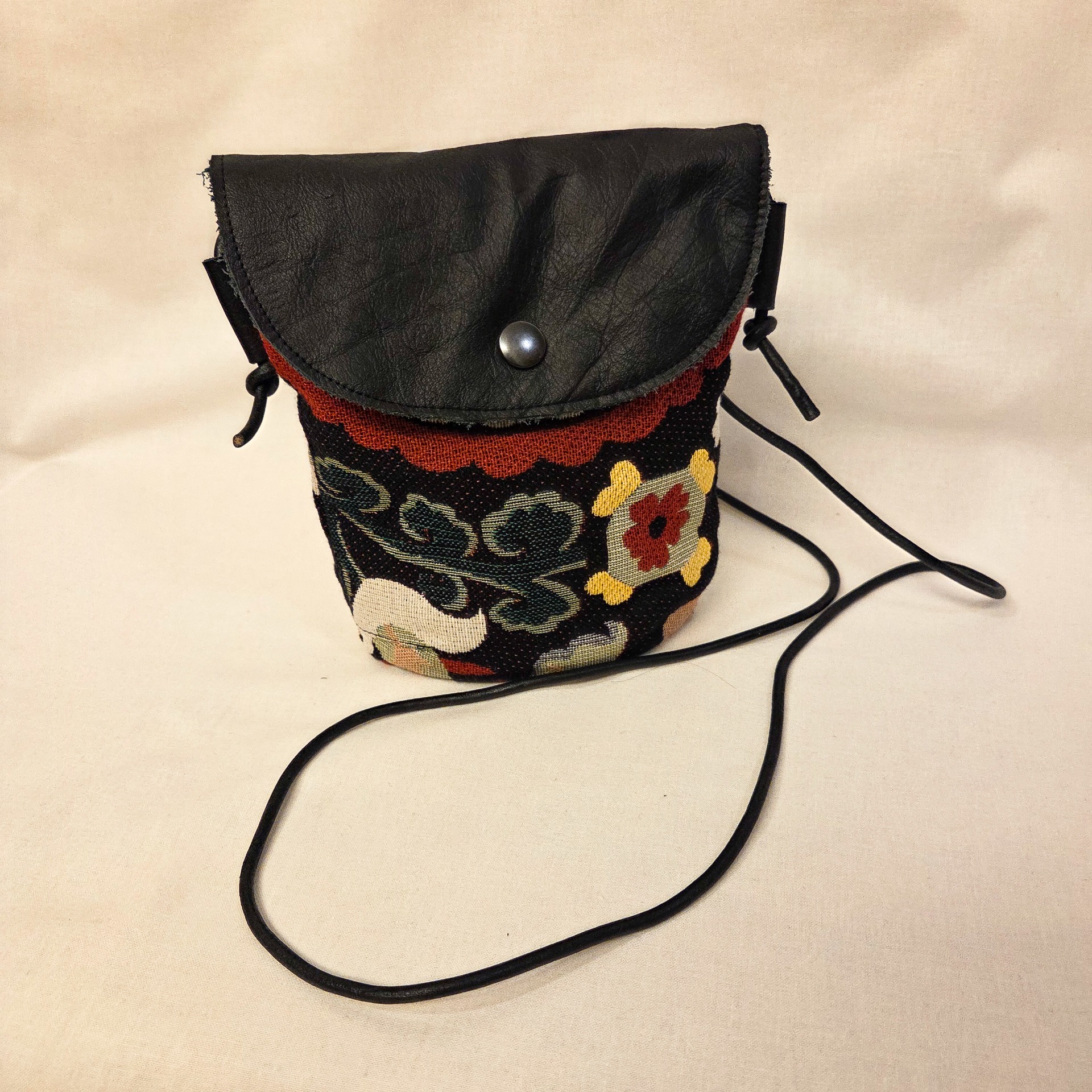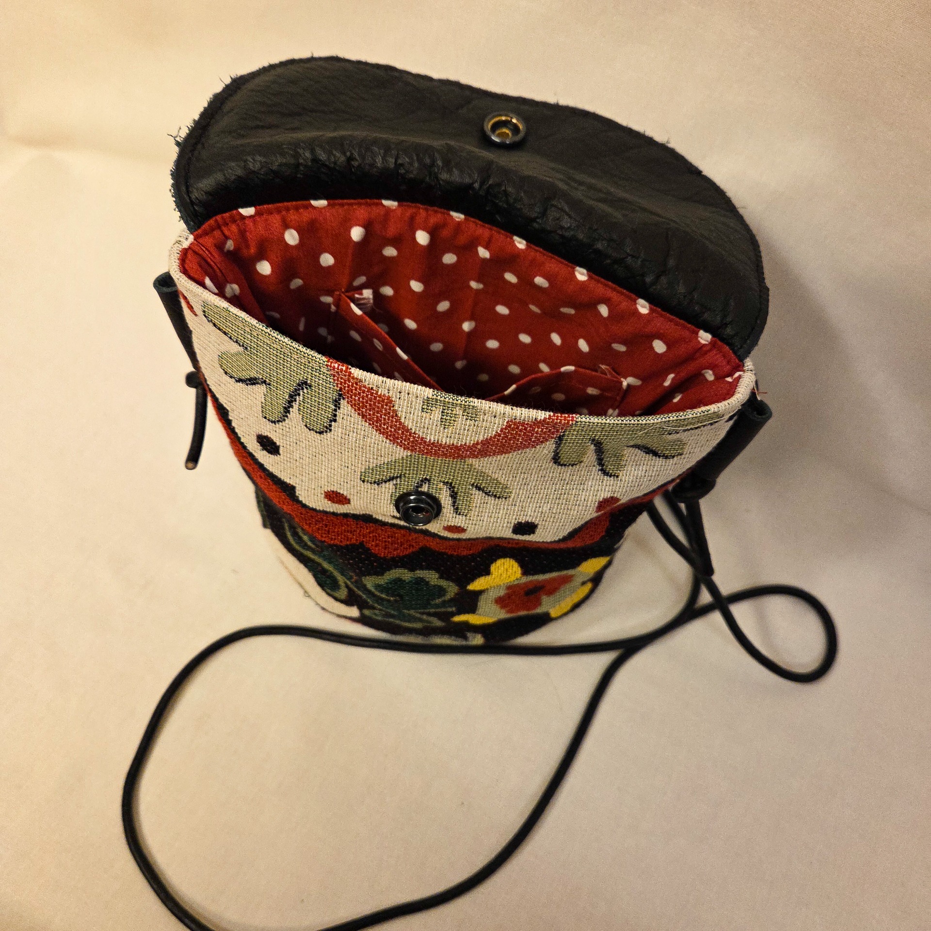 Små väskor är både snygga och praktiska att addera till sin outfit. Denna modell har vi haft förut men i andra material och mönster. Här i ett kraftigt blommigt yttertyg med ett svart skinnlock. Knäpps med en metall tryckknapp och fodrad med ett prickigt bomullstyg inkl. en innerficka. Läderremmen går enkelt att korta om man så önskar.