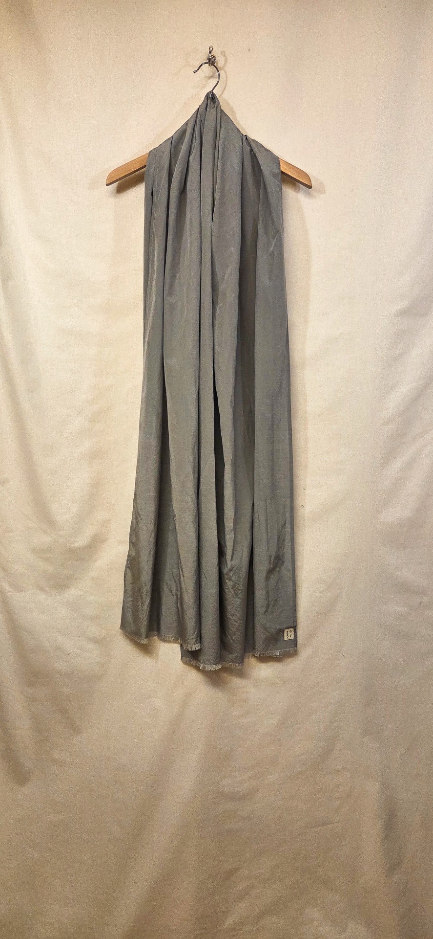 Lyxig sjal i ljusgrått siden. Generös i storleken och med fransar längs kortsidorna. Lyfter vilket plagg som helst, från jeans till festklänning. vardag som fest.