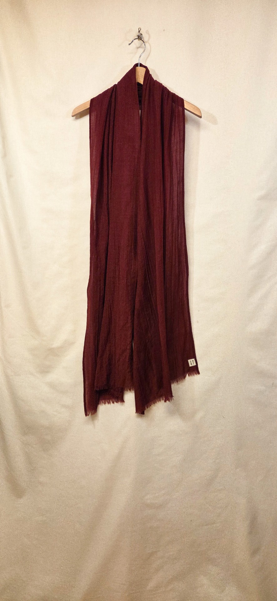 Denna sjal är i mjukaste merinoull. Generös i storleken och med fransar utmed kortsidorna. Värmer skönt runt axlarna och lyser upp med sin ljuvligt mörkröda färg. Efter att tyget tvättats så blev den lätt skrynklig vilket gjorde den ännu finare. Vill man inte ha den skrynklig så går det utmärkt att stryka ut den lätt.