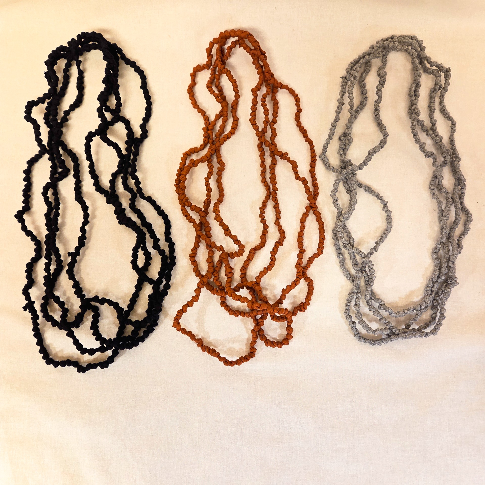 Dessa halsband är tillverkade av mjuk bomullsjersey med små knutor på en lång rad, närmare bestämt drygt 300 cm! Det gör att man kan välja efter humör och smak hur många varv som man ska vira den runt halsen. Halsbanden går att få i svart, mörk orange och ljusgrått.