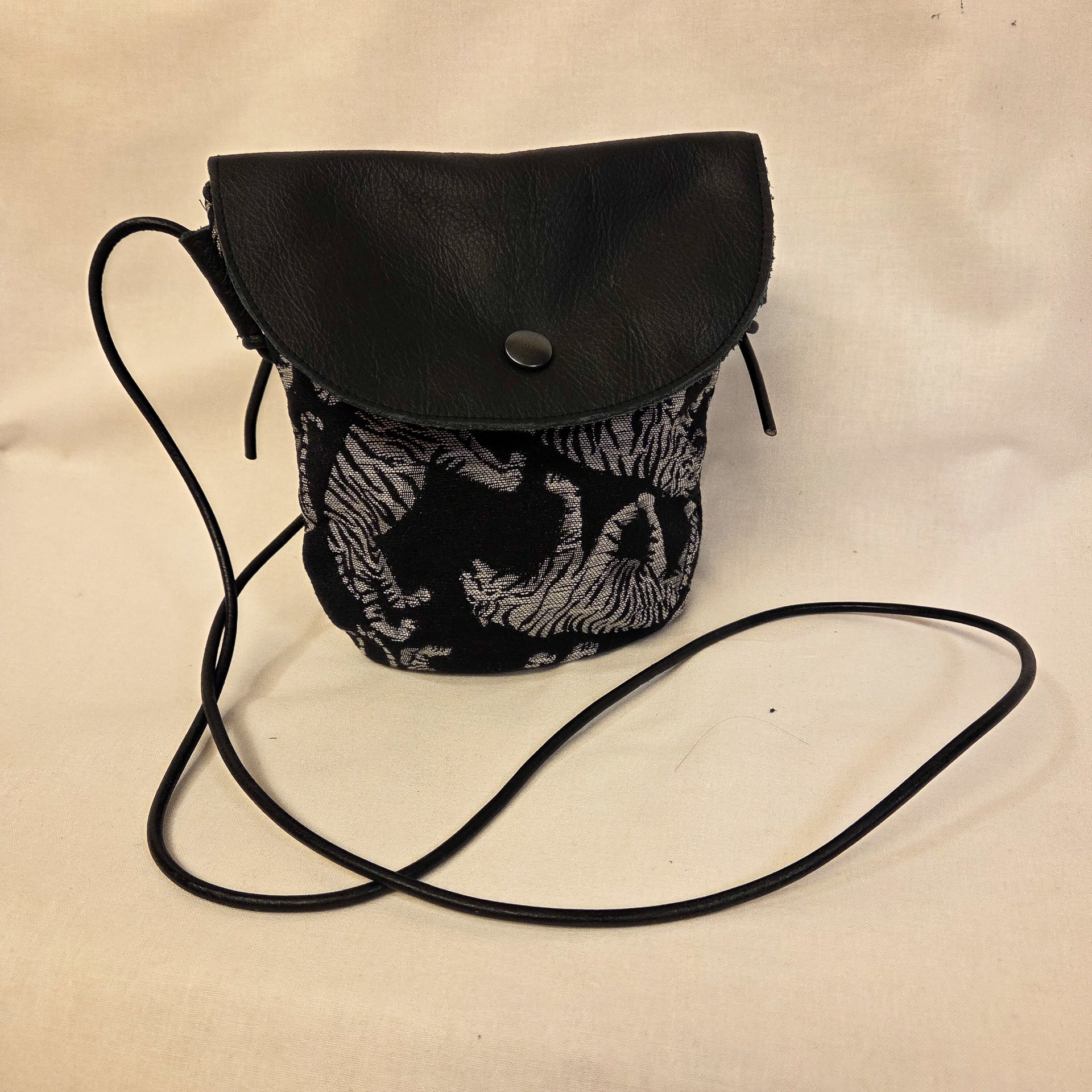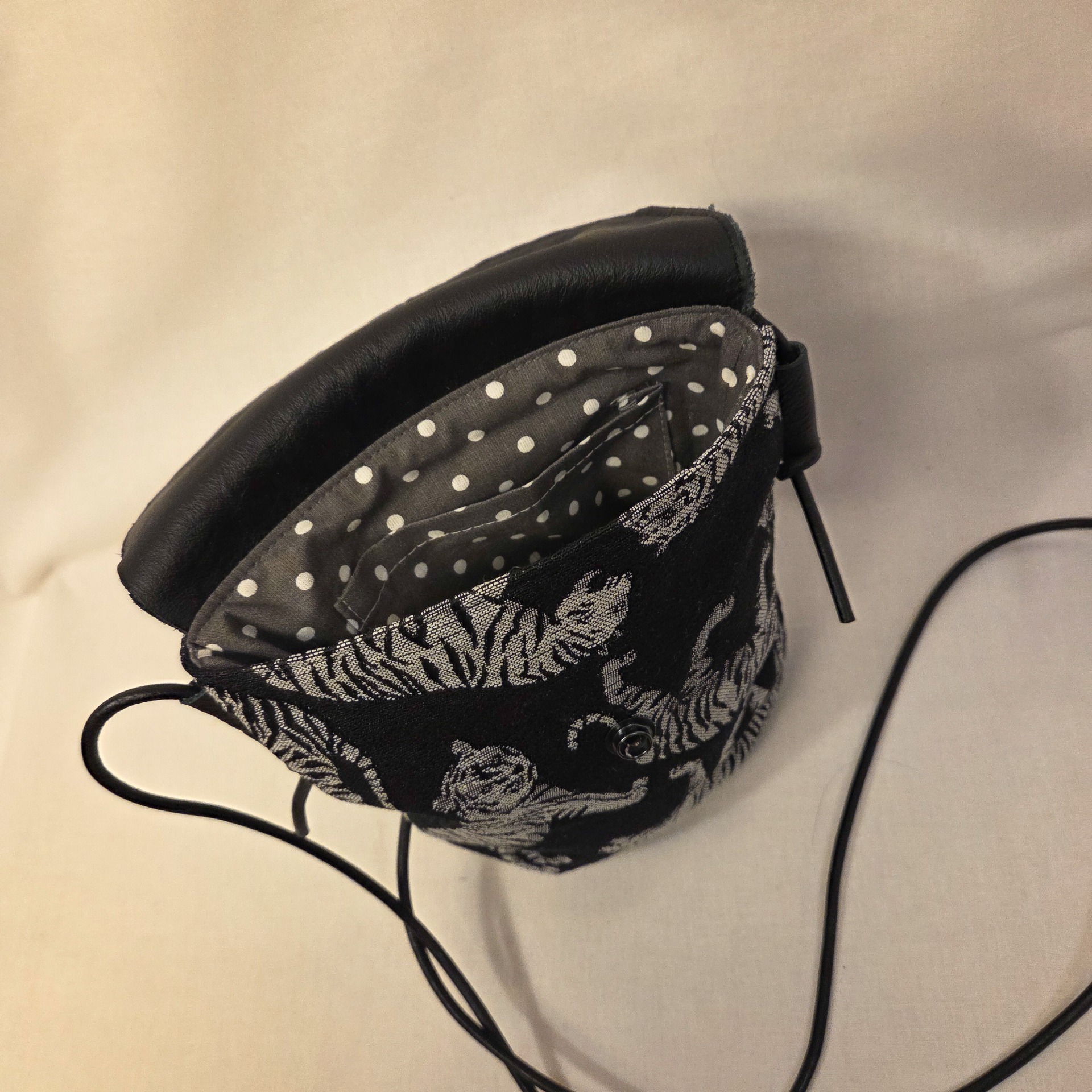 Små väskor är både snygga och praktiska att addera till sin outfit. Denna modell har vi haft förut men i andra material och mönster. Här i ett kraftigt tigermönstrat yttertyg med med ett svart skinnlock. Knäpps med en metall tryckknapp och fodrad med ett prickigt bomullstyg inkl. en innerficka. Läderremmen går enkelt att korta om man så önskar.