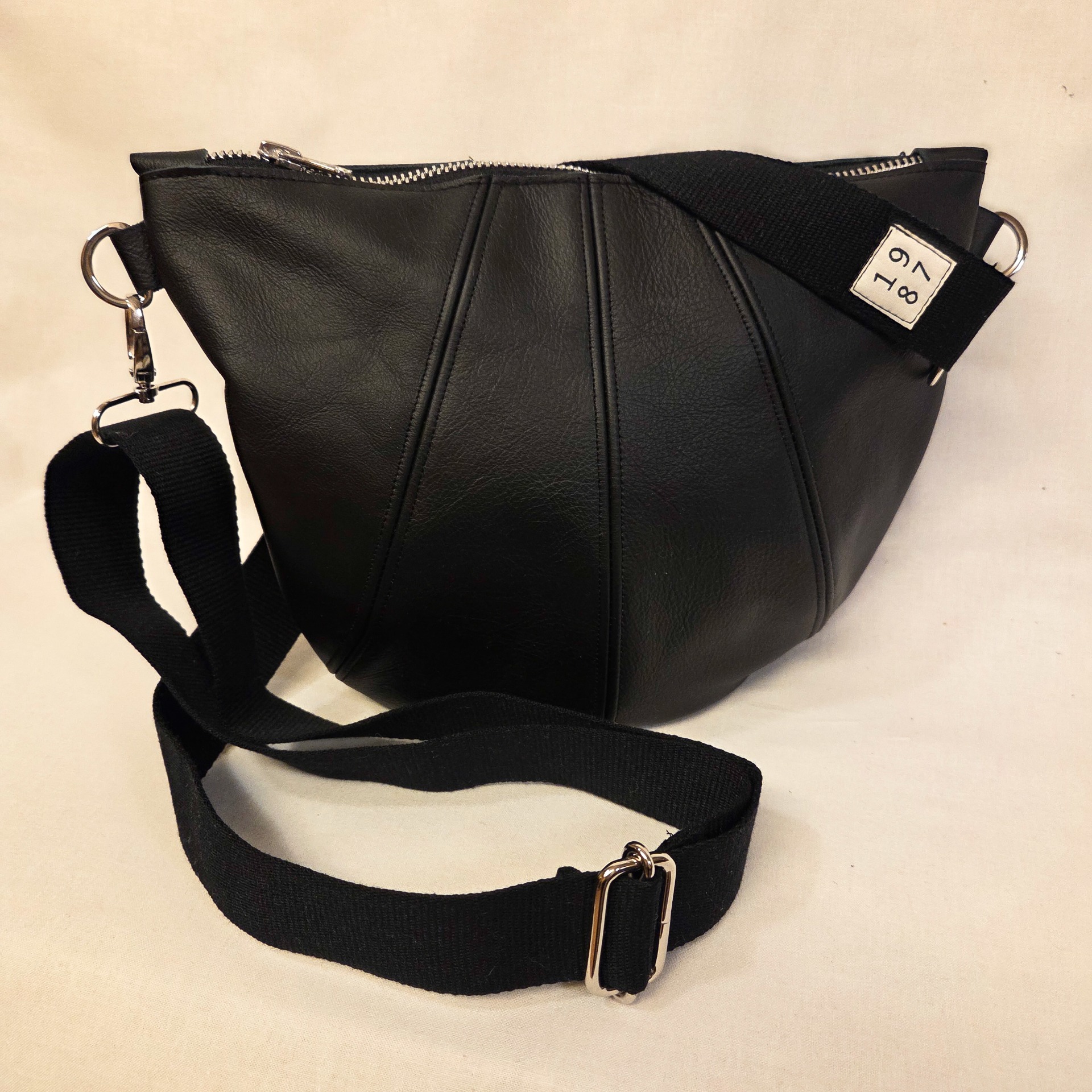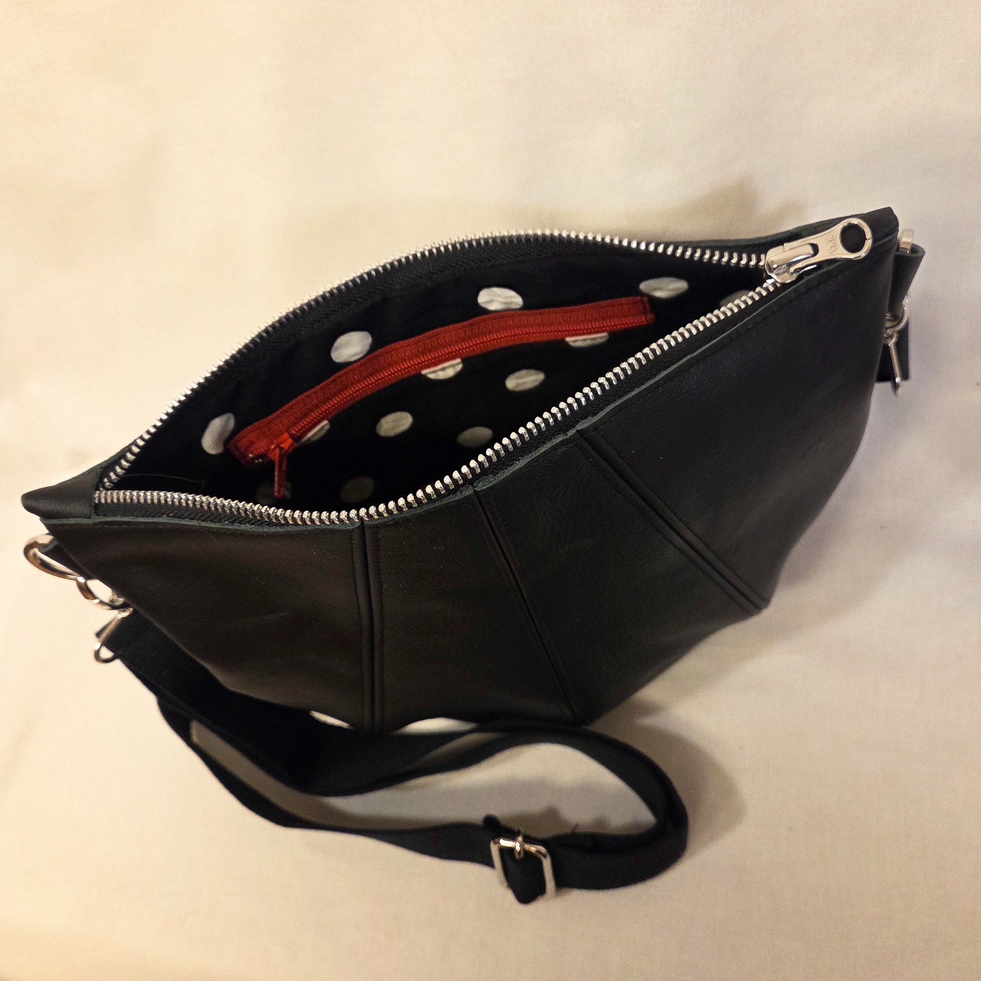 Svart, personlig skinnväska med dekorativa stickningar och rundad form. Fodrad med ett prickigt bomullstyg, två innerfickor, varav den ena med en röd dragkedja. Silverfärgad dragkedja och reglerbar textilrem.