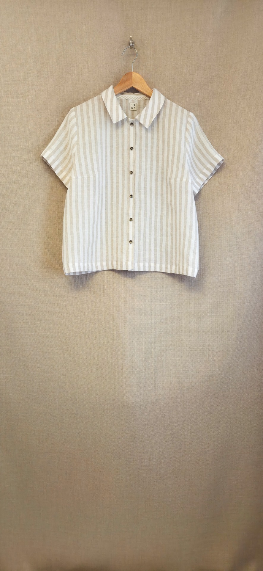 Tunn, randig linneblus som är rak i modellen, med liten nätt krage, korta ärmar och knäpps med små metallknappar. Perfekt plagg i garderoben och passar till det mesta. Tyget på bilden är i vitt/natur, men går även att få i vitt/blått.