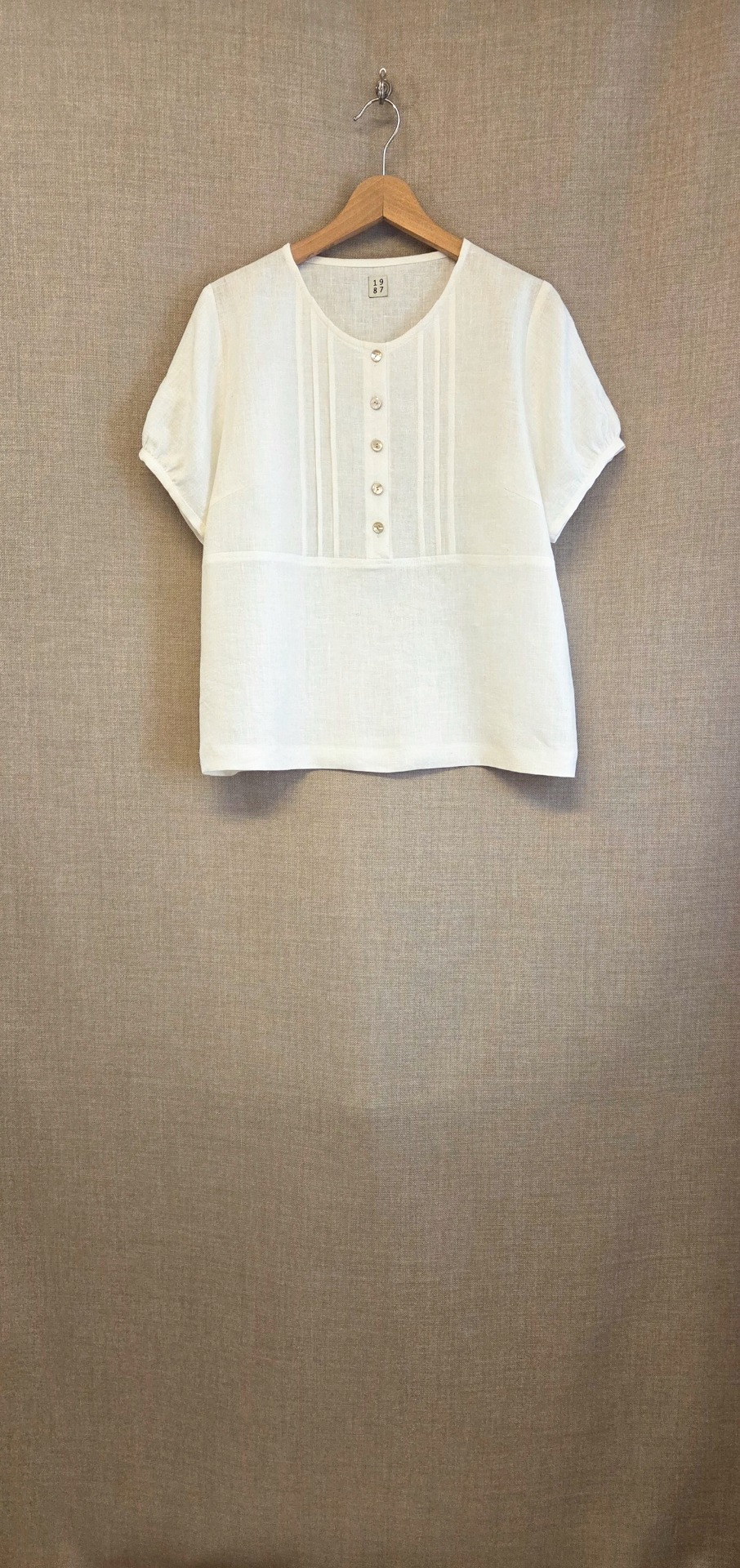Denna linneblus har också veck framtill och knäpps med små fina pärlemorknappar. Helt slät baktill, rund hals och bystinsnitt för bättre passform. Korta, lite puffiga ärmar som är rynkade mot en smal kant. Så fin till både jeans och byxor/kjolar i linne.